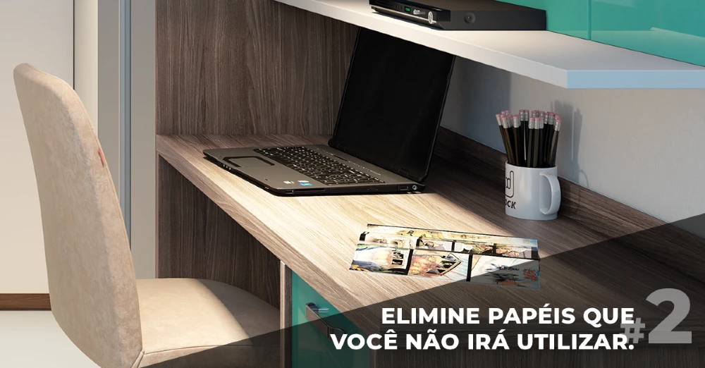 Papéis soltos espalhados pela mesa são os piores inimigos do foco. Temos a mania de achar que eles serão importantes em algum momento, mas a verdade é que se você não precisou deles em duas semanas, é provável que não precisará deles nunca. Jogue no lixo. Se você não desapega dos seus papéis tão fácil assim, pelo menos encontre um lugar fixo para eles, como uma gaveta, uma caixa ou uma pasta.